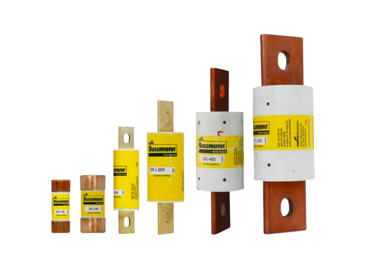 - Los fusibles DFJ, listados UL, Clase J, que proporcionan mayor protección para drives, CA y CD, y para equipos que emplean semiconductores de potencia.