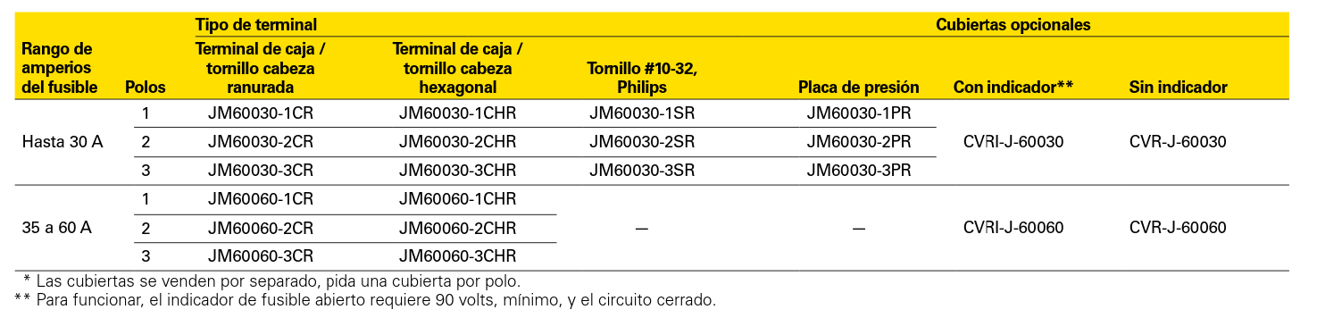 Están disponibles para toda la gama de amperios de fusibles Clase J.
